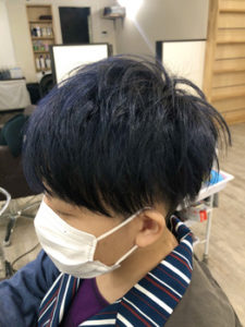 黒髪に入れてもわかりずらいブルーもベースをブリーチしたら透明感のあるブルーになります。